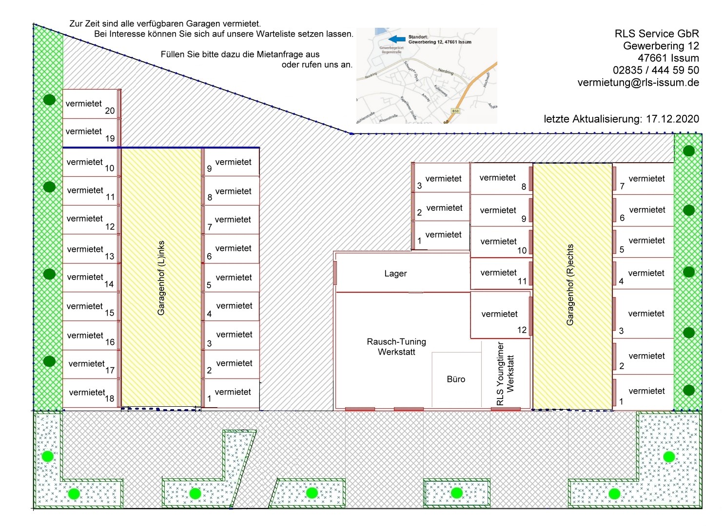 | Wir bieten: Garagen in verschiedenen Größen Elektrisches Sektionaltor fernbedienbar Geschlossene Gesamtanlage Garage mit Stromanschluß Garagenhof mit Luftanschluß Kameraüberwachung Werkstatthalle zur stundenweisen Anmietung Pflege- und Wartungsdienst KFZ-Service direkt nebenan Wir wünschen uns: Interesse an Young- und Oldtimern Pfleglicher Umgang mit den Einrichtungen Interessante Gespräche unter Gleichgesinnten Treffen und Events in der Anlage Downloads: Mietanfrage Mietvertrag Vermietungsstand Kontakt RLS Service GbR Rainer Rausch Tel: 02835 / 444 59 50 Email: Info@RLS-Issum.de |